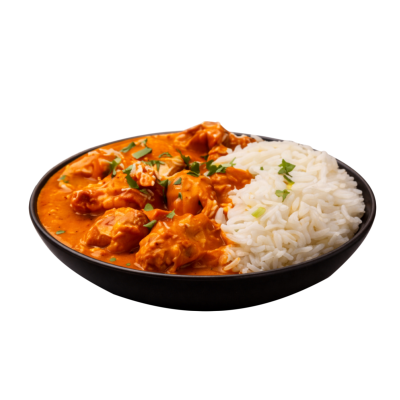 Chicken cooked in an Indian spicy, creamy tomato sauce with saffron rice and flat bread.